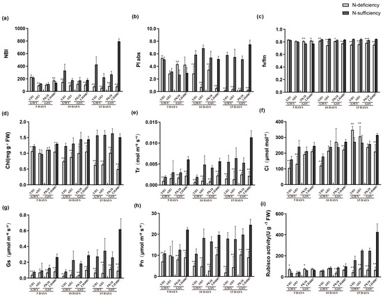 Responses of leaf gas exchange parameters to N-deficiency and N-sufficiency in different periods. (a) NBI nitrogen balance index; (b) PIabs performance index based on absorbed light energy; (c) Fv/Fm PSII primary light energy conversion efficiency; (d) Chl chlorophyll content in seedling leaves; (e) Tr transpiration rate; (f) Ci intercellular CO2 concentration; (g) Gs stomatal conductance; (h) Pn net photosynthetic rate; and (i) Rubisco activity. * significant at p < 0.05 level and ** significant at p < 0.01 level.