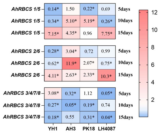 The gene expression of AhRBCSs showed differently responses to N-deficiency in different varieties. With N-deficiency, AhRBCS1/5 and AhRBCS2/6 changed from being significantly downregulated to being significantly upregulated. In contrast, AhRBCS3/4/7/8 changed from being significantly upregulated to downregulated with the increase in the N-deficiency duration for YH1 (Figure 6). For AH3, AhRBCS1/5 and AhRBCS 2/6 were significantly upregulated by more than 2.63-fold, of which AhRBCS2/6 was upregulated by 11.9-fold after 10 days of treatment (Figure 6). The expressions of AhRBCS1/5 were downregulated after 5 days by 0.22-fold while it was upregulated after 10 days by 5.19-fold, and no significant differences were noticed after 15 days for PK18 (Figure 6). The expressions of AhRBCS1/5 and AhRBCS2/6 in LH4087 were similar to YH1, showing significant upregulation ranging from 7.75- to 10.3-fold with the increase in the treatment time (Figure 6). Consistently, in all cultivars, the expressions of AhRBCS3/4/7/8 were significantly downregulated under N-deficiency.