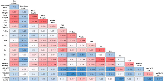 Correlation analysis based on all data. The brightest blue and the brightest red represents the greatest negative correlation and the greatest positive correlation, respectively. Chl content chlorophyll content in seedling leaves; Fv/Fm PSII primary light energy conversion efficiency; PIabs performance index based on absorbed light energy; NBI nitrogen balance index; Tr transpiration rate; Pn net photosynthetic rate; Gs stomatal conductance; AhRBCS1/5 the expressions of AhRBCS1/5 in leaves; AhRBCS2/6 the expressions of AhRBCS2/6 in leaves; AhRBCS3/4/7/8 the expressions of AhRBCS3/4/7/8 in leaves. * significant at p < 0.05 level and ** signifcant at p < 0.01 level.