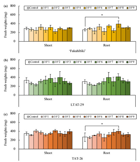 The fresh weights of (a) ‘Fukuhibiki’, (b) LTAT-29 and (c) TAT-26 inoculated with each concentration of B. pumilus TUAT1 spores cultivating in plant boxes for 18 days. * indicate significant differences at p ≤ 0.05 levels between control and treatment, respectively (Dunnett’s test, two-sided). Error bars indicate standard deviation (SD). n = 3.