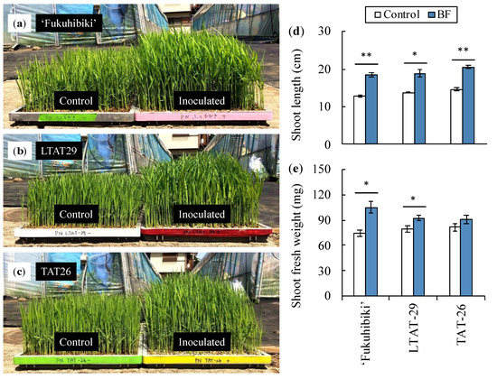 The shoot inoculated with Kikuichi/Yume-bio in the nursery box at the transplanting stage. The seedlings of (a) ‘Fukuhibiki’ at 21 days after sowing, and (b) LTAT-29 and (c) TAT-26 at 14 days after sowing on the nursery box are shown. The measured (d) shoot length and (e) shoot fresh weight are also indicated. * and ** indicate significant differences at p ≤ 0.05 and 0.01 levels between control and biofertilizer application in each treatment, respectively (t-test, two-sided). Error bar indicates standard deviation (SD). n = 3.