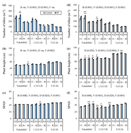 Summary of surveys on the paddy field. (a) The number of tillers, (b) the plant height, and (c) SPAD value measured at 8 weeks after transplanting. (d) The number of tillers, (e) the plant height, and (f) SPAD value measured at 13 weeks after transplanting. B: Biofertilizer, V: Variety, D: Distance, F: Fertilization. Each number inside of parenthesis is p value (ANOVA). * and ** indicate significant differences at p ≤ 0.05 and 0.01 levels between control and biofertilizer application in each treatment, respectively (t-test, two-sided). Error bar indicates standard deviation (SD). n = 3.