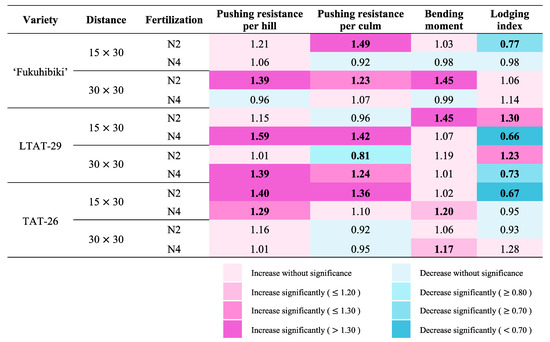 The biofertilizer significantly affected all analyzed factors, including plant height, fresh weight of shoots, culm numbers, pushing resistance per hill, pushing resistance per culm, lodging moment, and lodging index (Table S10). The numbers in the heatmap displaying the ratio of biofertilizer inoculated to non-inoculated related to lodging factors were indicated to understand the results more clearly (Figure 5). A high value of pushing resistance indicates tolerance to lodging. A high bending moment denotes an increase in the force of rice to collapse itself. The decrease in the lodging index indicates improved resistance to lodging. There was no significant reduction in pushing resistance per hill or bending moment due to biofertilizer inoculation. In ‘Fukuhibiki’, BF reduced the lodging index in the 15 × 30 cm and N2 treatments. The lodging index ratio of BF subjected to non-inoculated in all treatments in LTAT-29 showed significant differences. In LTAT-29, BF increased the lodging index under N2 and decreased the lodging resistance under N4 treatment with 15 × 30 cm or 30 × 30 cm transplanting distances. Biofertilizer inoculation increased the bending moment in LTAT-29 with 15 × 30 cm and N2 treatments, and decreased the pushing resistance per culm in LTAT-29 with 30 × 30 cm and N2 treatments. In TAT-26, the lodging index was significantly reduced in N2 with 15 × 30 cm spacing. The interaction effect of biofertilizer and distance on the pushing resistance per culm and lodging index is shown in Table S10.