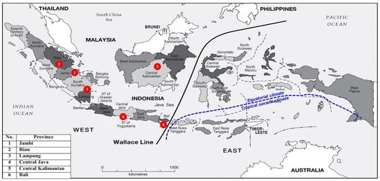Map illustrating the six wet-climate provinces of western Indonesia designated as study areas.