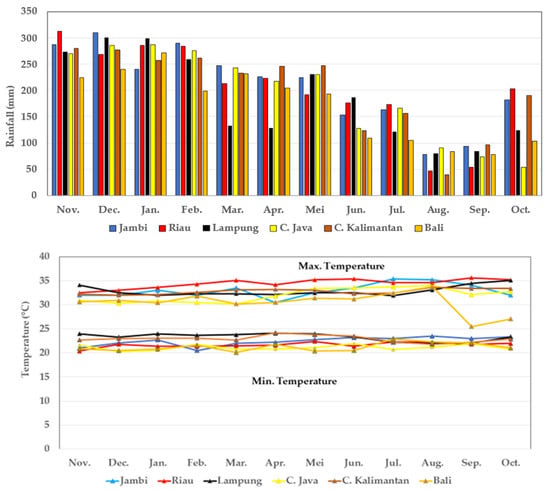 Data regarding the average monthly rainfall, and maximum and minimum temperature for the last ten years (2010–2019) were collected from climate stations in the study sites (Table 1). In Sumatra, Java, and Kalimantan, October/November coincides with the onset of the wet season for most areas, and the wet season continues until the end of June []. Figure 2 shows that for all study sites, the highest cumulative precipitation during the growing season was noted in Jambi at 1375 mm and the lowest in Bali at 1149 mm. The maximum temperature ranged from 25.5 to 35.4 °C, and the minimum temperature varied from 20.3 to 24.1 °C.