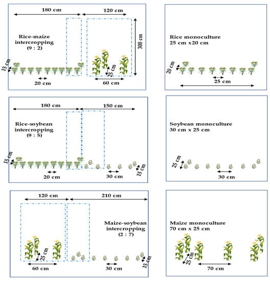 As the main crop under rice–maize intercropping, rice is planted two weeks before maize planting. Rice is planted with three to four seeds hill−1 and maize with one seed hill−1. Soybean is grown about two weeks after rice under upland rice–soybean intercropping. Upland rice is planted as a main crop with three to four seeds hill−1 and soybean is planted with two seeds hill−1. As the main crop in the maize–soybean intercropping, maize planting is carried out two weeks earlier than soybean planting. The farmers sowed one seed for maize and two seeds for soybean. The number of rows, inter-row distance, intra-row distance, and land proportion under different IPs and MPs for all crops are shown in Table 2 and Figure 3. For each IP, the sole upland rice at 160,000 plants ha−1, maize at 55,556 plants ha−1, and soybean at 133.333 plants ha−1 were maintained as MP controls. The fertilizer package comprised inorganic fertilizers of urea (45% N) and NPK (15:15:15). The fertilizer rates were 45 N, 22.5 P2O5, and 22.5 kg K2O ha−1 for sole upland rice, 135 N, 45 P2O5, and 45 kg K2O ha−1 for sole maize, and 37.5 N, 15 P2O5, and 15 kg K2O ha−1 for sole soybean. In the intercropping, fertilizers were applied proportionately based on the mixed ratio to the sole plant population for main crops and intercrops separately. The rates of fertilizer application and plant spacing were deliberately chosen, as they represent what the local farmers can usually afford on average.