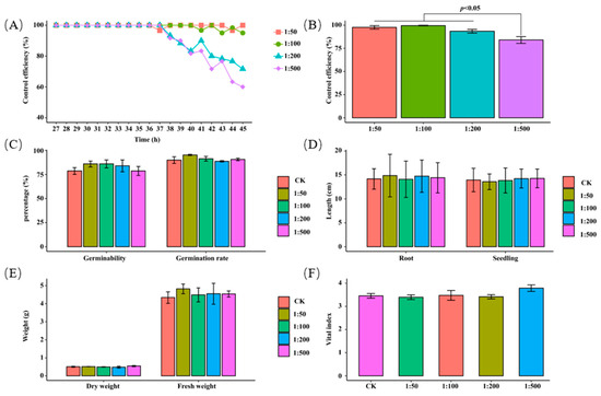Effect of TFC in the laboratory. (A) Control effect on wheat aphid infestation (B) and wheat sharp eyespot. (C,F) Wheat germinability and germination rates, (D) seedling heights and root lengths, and (E) fresh and dry weights.