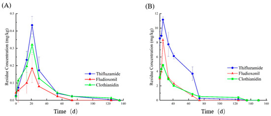 Dynamic changes in thifluzamide, fludioxonil, and clothianidin residues (mg kg−1) in the (A) soil and (B) plant samples (the recommended dosage).