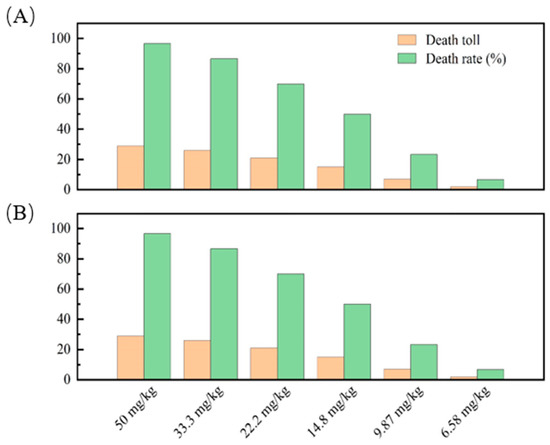 Earthworm mortality (A) 7 and (B) 14 days after treatment with six concentrations of TFC (mg/kg, dry soil): 6.58, 9.87, 14.8, 22.2, 33.3, and 50 mg/kg.