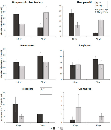 Table 4 shows the mean abundance and percent participation of the nematode genera to the total community for each “yr” × “sp” combination. Τhe bacterivore trophic group was the most rich in nematode genera, followed by that of plant parasites. There was a reduction in the number of genera from forty in the S–10yr sites to twenty-seven in S–70yr; five of them were plant parasitic, six were bacterivorous, one fungivorous and one omnivorous. Τhe communities at C–10yr, C–70yr and S–10yr were not over-dominated by a certain genus, but at S–70yr, the bacterivore Chiloplacus had 23% participation. Overall, most genera were cp-2 bacterivores or cp-3 plant parasites.
