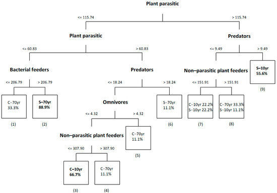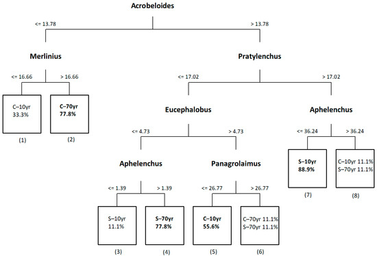 In Figure 3, we present the classification tree applied on the abundances of all recorded genera. The tree consisted of eight terminal and seven non-terminal nodes. The C–70yr sites were separated from the rest due to the low abundance of the bacterivorous Acrobeloides, and are characterized by the high abundance of the plant parasitic Merlinius (77.8% correct classification of samples, terminal node 2). On the other hand, the S–10yr and S–70yr sites were characterized by higher abundance of Acrobeloides and support distinct communities (88.9% and 77.8% correct classification of samples in nodes 7 and 4 respectively). The main difference between them was related with the abundance of the plant parasitic Pratylenchus, which was high in S–10yr and decreased in S–70yr. Samples from C–10yr sites exhibited the greatest variability compared to the rest, since only 55.6% of the samples were classified in the same terminal node 5. Other nematode genera also important in the distinction of samples from different sites were the bacterivorous Eucephalobus, Panagrolaimus and the fungivorous Aphelenchus.