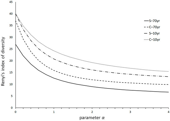 The diversity profiles of nematode communities at all sites are presented in Figure 4. The most diverse community was the one at C–10yr, followed by S–10yr, C–70yr and finally S–70yr. Thus, diversity was higher in recently invaded sites under both focal plant species, whereas nematode communities in Cichorium rhizospheres were more diverse than those under Solanum, regardless of the time after Solanum invasion.