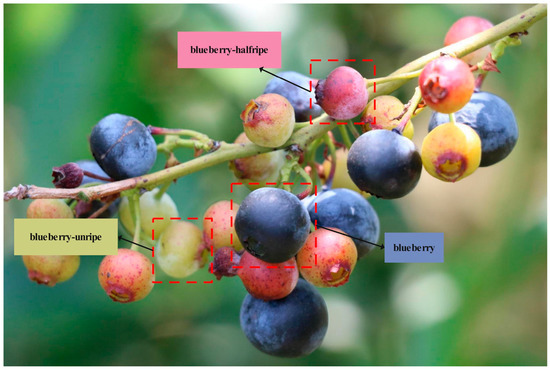 A blueberry dataset is constructed. Blueberry images growing in the natural environment were collected, and three kinds of blueberry with different degrees of maturity were marked with the LabelImg software. The blueberry images were augmented by data augmentation technology to enhance the generalization of the model, which can effectively avoid the overfitting problem during the training process.