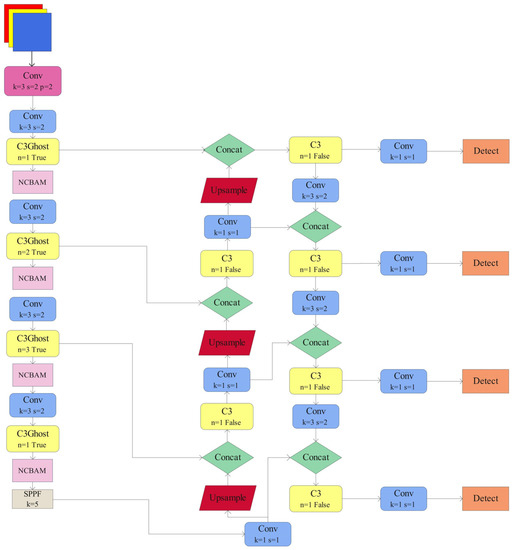 11] proposed a new detection method named YOLOv5-Aircraft, which solved the problem of insufficient detection accuracy and slowed the detection speed of aircraft targets in remote sensing images under complex backgrounds. In the method, the hourglass-shaped module CSAndGlass is designed on the backbone feature extraction network of YOLOv5 and the original residual module is replaced by CSAndGlass, which reduces the semantic loss. Therefore, based on the above research, we can clearly know that in terms of backbone network improvement, firstly, adding an attention module can enhance the feature extraction ability of detected objects, thereby improving the overall detection performance of the model. Secondly, the size of the model can be reduced by using the lightweight module, so as to achieve the purpose of improving the speed. Therefore, in this study, the NCBAM attention module we designed was added to the backbone network to improve the feature extraction ability of blueberries, and the C3 module was replaced with C3Ghost to reduce the model size.