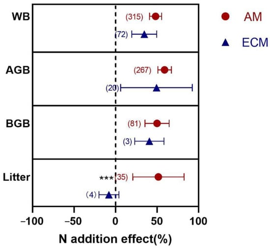 Effects of N addition on WB, AGB, BGB, and litter biomass of AM and ECM plants. AM means arbuscular mycorrhizal type with typical AM structures. ECM means ectomycorrhiza type with typical ECM structures. The symbols represent the average of the 95% confidence intervals (CIs). The effect is considered to be significant when the 95% CI does not overlap with zero. The chi-square test was used to test the heterogeneity of all index effects between AM and ECM plants (*** p < 0.001). WB, whole plant biomass; AGB, aboveground biomass; BGB, belowground biomass. The numbers in parentheses represent the sample size of observations.