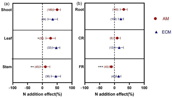 Effects of N addition on biomass of shoot, leaf, and stem (a) and biomass of root, CR, and FR (b) of AM and ECM plants. AM means arbuscular mycorrhizal type with typical AM structures. ECM means ectomycorrhiza type with typical ECM structures. The symbols represent the average of the 95% confidence intervals (CIs). The effect is considered to be significant when the 95% CI does not overlap with zero. The chi-square test was used to test the heterogeneity of all index effects between AM and ECM plants (*** p < 0.001, ** p < 0.01, and * p < 0.05). CR, coarse root; FR, fine root. The numbers in parentheses represent the sample size of observations.
