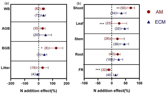 Effects of N addition on WB, AGB, BGB and litter biomass (a) and biomass of shoot, leaf, stem, root and FR (b) in AM and ECM woody plants. AM means arbuscular mycorrhizal type with typical AM structures. ECM means ectomycorrhiza type with typical ECM structures. The symbols represent the average of the 95% confidence intervals (CIs). The effect is considered to be significant when the 95% CI does not overlap with zero. The chi-square test was used to test the heterogeneity of all index effects between AM and ECM plants (*** p < 0.001, ** p < 0.01, and * p < 0.05). WB, whole plant biomass; AGB, aboveground biomass; BGB, belowground biomass; FR, fine root. The numbers in parentheses represent the sample size of observations.