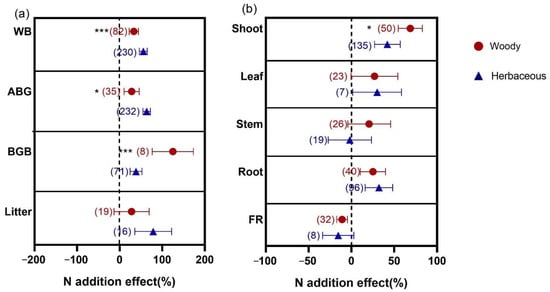 Effects of N addition on WB, AGB, BGB and litter biomass (a) and biomass of shoot, leaf, stem, root and FR (b) in Woody and Herbaceous in AM. AM means arbuscular mycorrhizal type with typical AM structures. The symbols represent the average of the 95% confidence intervals (CIs). The effect is considered to be significant when the 95% CI does not overlap with zero. The chi-square test was used to test the heterogeneity of all index effects between AM and ECM plants (*** p < 0.001 and * p < 0.05). WB, whole plant biomass; AGB, aboveground biomass; BGB, belowground biomass. FR, fine root. The number in parentheses represent the sample size of observations.