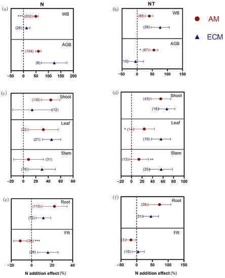 N addition effects on biomass of AM and ECM plants in response to N addition under added N alone (a,c,e) and added N together with other treatments (b,d,f). AM means arbuscular mycorrhizal type with typical AM structures. ECM means ectomycorrhiza type with typical ECM structures. N means only N addition. NT means N addition with other treatments. The symbols represent the average of the 95% confidence intervals (CIs). The effect is considered to be significant when the 95% CI does not overlap with zero. The chi-square test was used to test the heterogeneity of all index effects between AM and ECM plants (*** p < 0.001, ** p < 0.01, and * p < 0.05). WB, whole plant biomass; AGB, aboveground biomass; FR, fine root. The numbers in parentheses represent the sample size of observations.