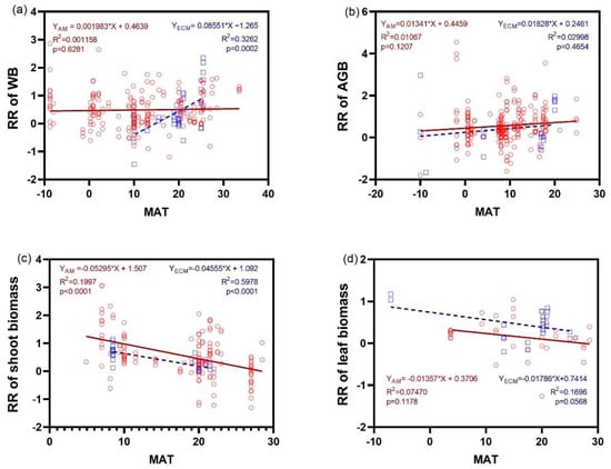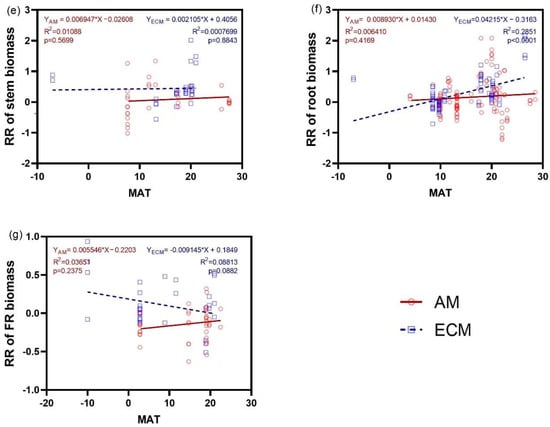 The response ratio in AGB of AM and ECM plants did not exhibit any significant trend with MAT (p > 0.5) (Figure 6b). However, the response ratio in WB of ECM plants significantly increased with MAT (Figure 6a). Furthermore, the response ratio of shoot biomass decreased significantly with MAT, with a higher slope in AM plants (r2 = 0.5978) than in ECM plants (r2 = 0.1997). When root was considered, only the response of biomass in ECM plants increased significantly as MAT increased (Figure 6f). There were no regressions between the response ratios of biomass of leaf, stem, and FR and MAT.