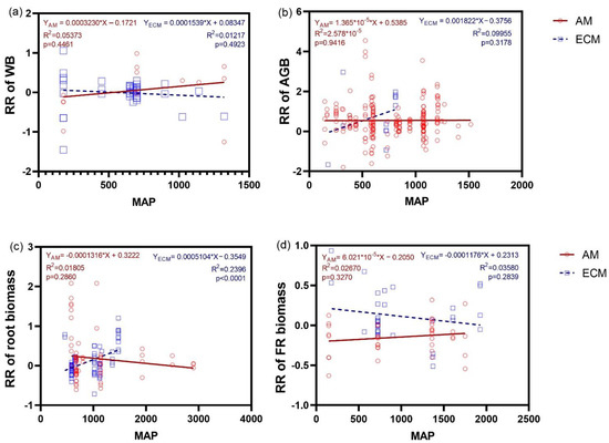 Relationship between the ratio response (RR) of WB (a), AGB (b), the biomass of root (c) and FR (d), and changes of MAP (Mean annual precipitation) under N addition between AM and ECM plants. Each point in the figure represents a different observation. AM, arbuscular mycorrhiza; ECM, ectomycorrhiza; WB, whole plant biomass; AGB, aboveground biomass; FR, fine root.