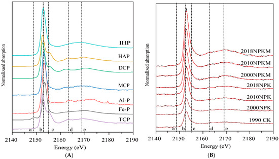Reference P standard and soil samples were analyzed using P K-edge XANES spectroscopy at the 4B7A soft X-ray beamline of the Beijing Synchrotron Radiation Facility, Beijing, China. The electron energy of the storage ring operated at 2.2 GeV, and the maximum beam current was 250 mA. After being air-dried, finely ground, and sieved (0.5 mm particle size), the soil samples were thinly spread over a P-free and double-sided carbon tape and then placed on a sample holder to collect XANES data [53]. P standard samples were measured under total electron mode without self-absorption effects, P reference spectra were collected in partial fluorescence yield mode; in the meantime, multiple spectra for each sample were collected and averaged [27,54]. The spectra of P standards included iron phosphate dihydrate [Fe-P, FePO4·2H2O], aluminum phosphate [Al-P, AlPO4], dibasic calcium phosphate [DCP, CaHPO4·2H2O], monobasic calcium phosphate monohydrate [MCP, Ca(H2PO4)2·H2O], tricalcium phosphate [TCP, Ca3(PO4)2·xH2O], hydroxyapatite [HAP, Ca5(PO4)3OH], and inositol hexakisphosphate (IHP). The characteristic features of P K-edge XANES reference spectra of the calibrated P standards samples are shown in Figure 1A. The characteristic post-white linke peak b and an oxygen resonance peak e were at 2152 eV and 2169 eV, respectively [18]. Specifically, the pre-edge peak a (2148.0 eV) was the characteristic feature of Fe-associated P (Fe-P), the shoulder peak c (around 2155 eV) and peak d (approximately 2162.5 eV) were for Ca-associated P (Ca-P) [17,55]. All the XANES data, such as spectra averaging, background correction, and normalization, were analyzed with ATHENA (Version 0.9.26, Amazon Web Services, Inc., Seattle, WA, USA) [56]. The beamline energy was calibrated to 2149 eV (E0) using the first derivative peak of the AlPO4 standard [22]. The improvement of the signal-to-noise ratio of spectra was realized through multiple scans for each sample. Linear combination fitting (LCF) of the sample spectra was conducted using the spectral region between −10 eV to 15 eV relative to E0 to identify the P species and estimate their proportions. The sum weights of all the P standards were forced to 1. The goodness-of-fit was assessed by the R-value and chi-squared values, and the P standards yielding the best fit were regarded as the most possible P speciation in the investigated soil samples.