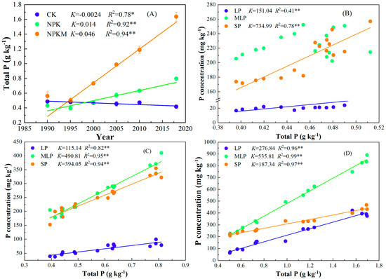 Total P content (A) and its relationship with P fraction in CK (B), NPK (C), and NPKM (D) treatments under long-term field trial in Mollisol. Fitted curves were: y = Kx + b. CK, no fertilizer input; NPK treatment, applying N, P, K fertilizer; NPKM treatment, applying NPK and manure (pig manure from 1990 to 2004, and cattle manure from 2005 to 2018). Total P, the sum content of each P fraction extracted by the Hedley sequential method. LP (labile P), the sum content of resin-P, NaHCO3-Pi, and NaHCO3-Po, MLP (Mid-labile P), the sum content of NaOH-Pi, NaOH-Po, and dil.HCl-Pi, SP (stable P), the sum content of conc.HCl-Pi, conc.HCl-Po and residual P. * and ** mean the relationship between total P and P fraction in p < 0.05, p < 0.01 level, respectively.
