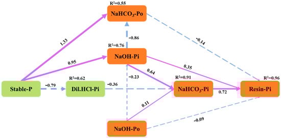 P availability is determined by P-existing species present in the soil [23]. Solution Pi pool can be directly used by plants, while a large portion of P fractions interact with soil solid-phase. Structural equation modeling (SEM) enables quantitatively evaluating the importance of different P fractions transformations in regulating the availability of P in soil via a comparison between the observed covariance matrix and implicit covariance matrix in the current model [24,25]. At present, the quantitative analysis of the transformation of P fractions by SEM is mainly focused on unfertilized or forest soil, highlighting the importance of Po fraction in soil P dynamics [10,25,26]. With the continuous input of fertilizer P, more available P is accumulated in the form of Pi in the soil, influencing the transformation process of soil P [27,28]. So far, few pieces of research focus on direct and indirect quantitative effects of various P forms on P availability.