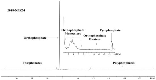 Solution 31P-NMR was performed to classify the P composition of soil and manure samples based on the method described by Liu et al. [8,13]. Briefly, 3.00 g samples were extracted with 30 mL 0.25 M NaOH + 0.05 M Na2-EDTA solution (16 h) at 20 °C, and centrifuged (5000 rpm, 30 min). After freeze-drying (−80 °C), the subsample was successively re-dissolved into 0.65 mL following solutions, D2O, deionized water, and the extracting solution (0.25 M NaOH + 0.05 M Na2EDTA), and 0.4 mL 10 M NaOH. Then, the solution was centrifuged and transferred into a 10-mm probe for NMR analysis. Solution 31P-NMR spectra were obtained through a Bruker Avance 500 MHz spectrometer. NMR parameters were 90° pulse, 5 s relaxation delay, 0.68 s acquisition time, 20 °C, 2200–3500 scans, 12-Hz spinning, and no proton decoupling as described previously [8]. Along with the peak of orthophosphate standardized at 6 ppm, the signals and chemical shifts (ppm) were used to identify the P compounds according to the publications [57] and by spiking samples with reference standards (α- and β-glycerophosphate, myo-IHP, adenosine 5′ monophosphate, and choline phosphate) [13]. Generally, the degradations, including mononucleotides, α- and β-glycerophosphate, were considered diesters rather than monoesters [58,59]. Signal areas were integrated with MestReNova (Version 11.0, Mestrelab Research, Spain).