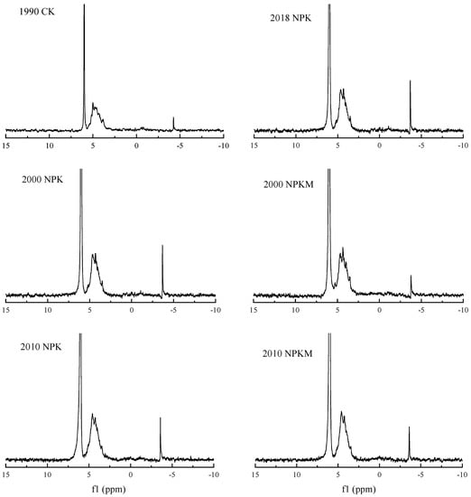 The 31P-NMR fraction extracted by NaOH-EDTA and the chemical shifts associated with P fractions of studied soil samples is shown in Figure 4. The recovery rate of the NaOH-EDTA extraction for 31P-NMR was 26.7–62.7% of the total P in this experiment (Table 3). The application of P fertilizer significantly improved the proportion of soil Pi fractions, especially in orthophosphate, with the proportion 28.6–47.3% higher in NPKM treatment than in NPK treatment (Table A1). Orthophosphate monoesters, accounting for 20.0–49.2%, were dominated by the stereoisomers of IHP (e.g., myo-IHP, scyllo-IHP, and neo-IHP), α and β -glycerophosphate, mononucleotides, choline phosphate, and glucose 6-phosphate in both P fertilization regimes. By correcting the degradation products, the proportion of orthophosphate monoester and orthophosphate diester was 19.0–53.3% for NPK and 1.55–8.25% for NPKM, respectively. A decreasing trend in the proportion of orthophosphate monoester and orthophosphate diester was exhibited in both P fertilization treatments from 1990 to 2018.