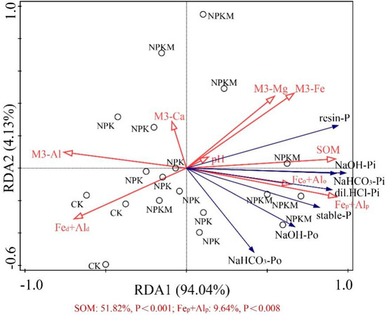 Correlation between soil properties and P fraction contents under long-term different fertilization regimes with redundancy analysis (RDA) triplots. SOM, soil organic matter; Fed + Ald were the sum of free iron (Fe) and aluminum (Al) oxide; Feo + Alo were the sum of amorphous Fe and Al oxides; Fep + Alp were the sum of humus complex Fe and Al oxides. M3-Mg, M3-Fe, and M3-Al were Mg, Fe and Al extracted by Mehlich-3 extraction. Stable P, sum P pool of conc.HCl-Pi, conc.HCl-Po, and residual P.