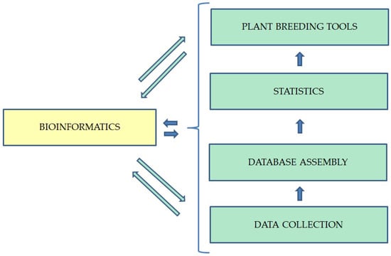 Knowledge that helps us to deeply understand the biological data through methods and software tools is bioinformatics (BI). A link between biology and computer science [38], BI plays an essential role in modern methods of plant breeding. The baggage of tools that bioinformatics provides facilitates the understanding of the biological and genetic processes that underlie the selection process. As Pauline Hogeweg, one of the promoters of BI states, the term was used for the first time by her and Ben Hesper, in the beginning of 1970s and defining “the study of informatics processes in biotic systems” [39,40]. Over the past years, advanced research in the field of biology, genetics, but also artificial intelligence, has led to the reconfiguration and development of the meaning of BI [38,40,41]. At present, evolutionary biology goes ‘hand-in-hand’ with bioinformatics, due to the fact that the first provides the scientific data and the second manages and analyzes them [42].