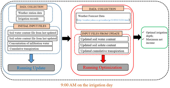 Figure 1. Steps of the proposed irrigation depth determination schedule. Two main steps (Running Update and Optimization runs) were performed by WASH_2D at 9:00 AM of the irrigation day. Left blue box shows the first step of simulation (Update). The right red box shows the second step of simulation (Optimization). The black arrow between two boxes shows the directions of data flow.