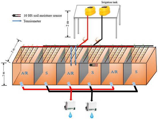 Figure 3. Schematic representation of the experimental setup. The red tube connected to left yellow water tank was arranged for irrigation of A/R plots and black tube connected to right side was for S plots (A/R stands for Automated irrigation in first season or Refilling treatment in second season, S stands for Schemed irrigation). There were four 10 HS sensors installed at different position of soil profile in the middle plot of S treatment (only one shown in Figure). Two 20 cm tensimeters were installed at the middle plot of A/R.
