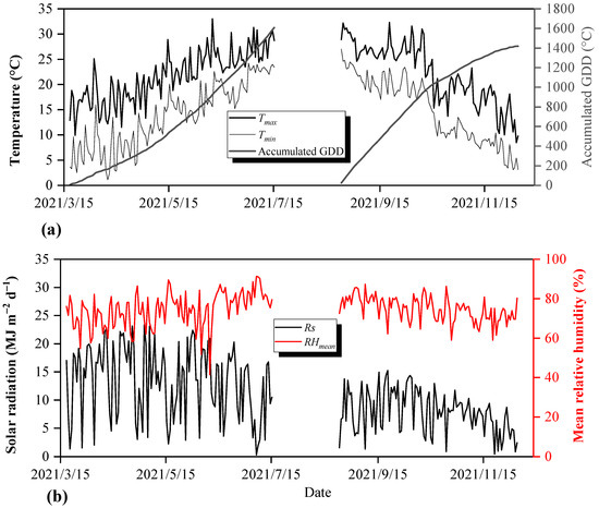 Figure 6. Meteorological condition from sowing to harvest of potato in two growing seasons in 2021. (a) daily maximum temperature, minimum temperature, and accumulated growing degree days (Tmax, Tmin, and Accumulated GDD, respectively), (b) solar radiation (Rs) and mean relative humidity (RHmean). Accumulated GDD= [(Tmax + Tmin)/2-4.4 °C], base temperature was set at 4.4 °C [32].