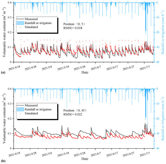 At the depth of 45 cm (Figure 7b,d), VWC significantly increased when there was a heavy or continuous rainfall, such as, April 29 and May 2 in the first season, and October 17, 23 in second season. The RMSE at the depth of 45 cm was 0.022 and 0.014 m3 m−3 in the first and second season, respectively, indicating that simulated and measured VWC were in fair agreement at deep zone.