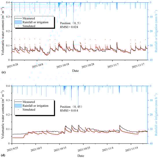 Figure 7. Comparison of simulated and measured VWC of treatment S at the depth of 5 cm and 45 cm below the drip tube in two seasons. (a,b) are the VWC at the site of (0, 5) and (0, 45) in the first season, respectively; (c,d) are the VWC at the site of (0, 5) and (0, 45) in the second season, respectively. RMSE is root mean square error.