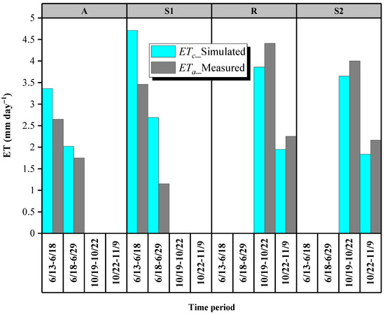 Figure 8. Comparison of measured ETa and simulated ETc under different treatment in two seasons. (6/13–6/18 and 6/18–6/29 time periods were chosen for the first season, 10/19–10/22 and 10/22–11/9 time periods were chosen for the second season).