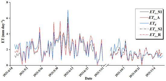 Figure 9. Time evolution of the reference ET (ET0) and daily ETc of different treatments during crop growth period in two growing seasons.