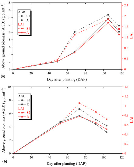 Figure 10 shows the LAI and above ground biomass (AGB) of potato measured in the two seasons. LAI and AGB are important indicators of crop growth, which determine the light interception capacity of the crop and photosynthetic accumulation of crop [33,34]. Both LAI and AGB had no significant difference at establishment and stolon initiation stage (15 < DAP < 40) in two seasons. But at the tuber initiation and filling stage (45 < DAP < 90), S1 and S2 were significantly higher than A and R in the first and second season, respectively, no matter for LAI or AGB. This situation might be due to higher nutrient utilization of S, especially nitrogen (N), a macronutrient that promotes carbon metabolism and plant growth, leading to biomass accumulation [35]. At the maturity stage (DAP > 90), both LAI and AGB decreased due to leaf senescence. It should be noted that the smaller canopy structure of potato in the second season led to delayed growth and reduced final yield, which mainly comes from low temperature and solar radiation during the critical growth stage.