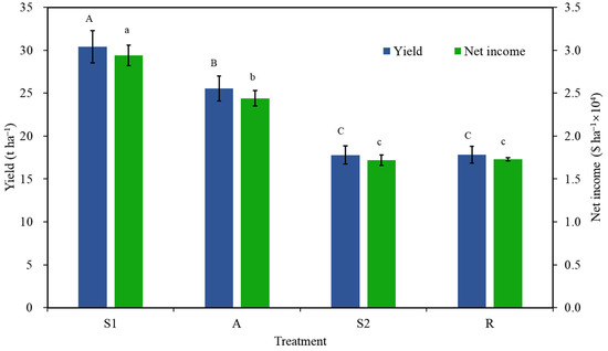 Figure 11. Comparison of yield and net income of different treatments in two seasons. (The error bars show the standard deviation of three replicates. The different uppercase letters indicating significant difference of yield under different treatments at p < 0.05, while the lowercase letters indicating significant difference of net income under different treatments at p < 0.05).