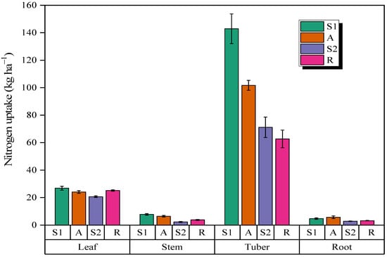 The nitrogen storages in each part of potato are listed in Figure 12. The total nitrogen uptake for A and S1 in the first season were 138 and 182 kg ha−1 while that for R and S2 in the second season were 95 and 97 kg ha−1. The NUPE of S1 and S2 were 39% and 11% higher than A and R, respectively. Among that, the nitrogen storage in the tuber was the highest. The discrepancy of nitrogen uptake between two seasons was due to less nitrogen input and dry matter in the second season. The higher nitrogen uptake may have contributed to higher yield.