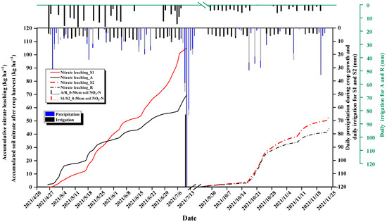 Figure 13. Accumulative nitrate leaching (2 m soil depth) during the growing period and accumulated soil nitrate content after crop harvest at 0–50 cm root zone depth (left axis); Daily precipitation amount in two seasons and daily irrigation amount for S1, S2, A and R (S1 and S2 using inner right axis, while A and R using outer right axis).