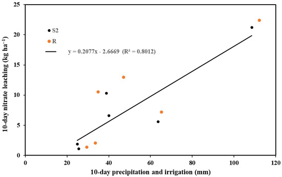 Figure 14. Linear regression between 10-day precipitation plus irrigation and 10-day nitrate leaching at 2 m soil depth in second season.