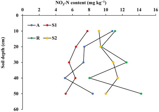 As shown in Figure 13, the accumulative nitrate leaching at the outlet of the lysimeters of S1 and S2 were 105 and 54 kg ha−1, which were 51 and 22% higher than A and R, respectively. The higher nitrate leaching in the first season is likely due to higher N supply and evenly distributed irrigation and precipitation. Though the total irrigation amount of A was higher than S1 in first season, the irrigation activities were concentrated in the early stage, while during late growth stage, less water was supplied due to large amount of rainfall. Such as from June 3 to 23, there was only 4.8 mm irrigation for A. Another possible reason is that frequent irrigation in treatment S increased the chance of nitrate leaching, while large amount of irrigation in treatment A for each time diluted the concentration of nitrogen. According to the results of this study, intensive irrigation might lead to nitrate leaching. In addition, we further analyzed the relationship between the nitrate leaching and water supply in terms of precipitation plus irrigation during second season (Figure 14). The linear regression can describe the relationships well between precipitation plus irrigation and nitrate leaching (R2 = 0.80). Huang et al. [36] also reported similar relationship between monthly precipitation plus irrigation and monthly nitrate leaching. The accumulated soil nitrate after crop harvest matched the accumulative nitrate leaching. Higher accumulated soil nitrate of A and R (550 and 78 kg ha−1) coincide with lower nitrate leaching in the two seasons, respectively. Furthermore, we also measured the soil nitrate content at different soil depths to evaluate the soil nitrate distribution at root zone (Figure 15). The nitrate content of A changed from 5.1 to 10.8 kg ha−1 at 0–50 cm soil layer in first season, higher than that of S1 except for the depth of 30–40 cm. The same trend was obtained in the second season, nitrate content of R ranged from 8.0 to 14.3 kg ha−1. The increment of soil nitrate content in the second season might be due to decreased amount of precipitation plus irrigation (average 297 mm) compared with the first season (average 807 mm), resulting in a decrease in nitrate leaching and an increase in soil nitrate stock.