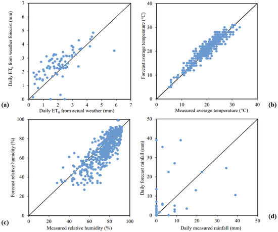 Figure 16. The comparison between weather station measured and forecast weather factors. (a) reference evapotranspiration (ET0), mm; (b) hourly average temperature, °C; (c) hourly relative humidity, %; (d) daily rainfall, mm.
