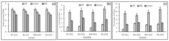 Screening for blast resistance in an inbred upland rice line using four isolates, BT-021, BU-022, RM-023, and BS-024, under greenhouse conditions: (a) the latent period, namely the time until lesions first appeared in the tested lines and the SP-resistant and KB-susceptible control varieties; (b) the number of leaf lesions on the tested lines and the SP-resistant and KB-susceptible control varieties. “*” indicate statistical significance by two-tailed Student’s t-tests (p < 0.05); (c) percentage of lesions appearing on leaves counted in one clump