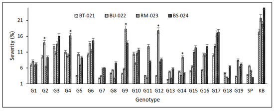 Expression of severity in 19 inbred upland rice lines, SP and KB as resistant and susceptible control varieties, respectively, which were inoculated with four isolates, BT-021 and BU-022, RM-023, and BS-024. Asterisks indicate statistical significance by two-tailed Student’s t-tests (p < 0.05).