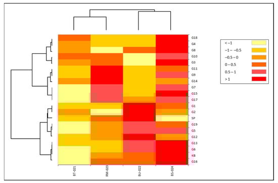 Overall, 19 lines inoculated with four isolates, BT-021, BU-022, RM-023, and BS-024 showed varying blast resistance. The latent period, i.e., up to when the first lesion appeared in susceptibility checks, was less than 3 days for K. Bali, whereas it appeared later during checks of SP-resistant strains (Figure 2a). This is also evident from the number and percentage of lesions (Figure 2b,c). This shows that the susceptible varieties have a high degree of susceptibility to blast disease. Several rice cultivars showed resistance to blast disease, with lower severity observed for G7, G8, G9, G11, G13, G14, 218 G15, and G18, although G11 was sensitive to isolates RM-023, BS-024. This showed that the blast race has genetic diversity that causes different responses in plants (Figure 3). Interestingly, isolates BU-022 and BS-024 tended to be more virulent than BT-021 and RM-023. It can be seen from the heat map based on the severity of the 19 upland rice lines, where high values are shown in red, and low values are shown in yellow (Figure 4).