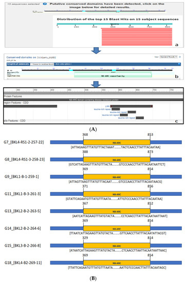 (A) BlastX translated nucleotide protein in the NCBI gene bank; (a) query sequence with 15 subjects homologous to the data in the gene bank; (b) the putative conserved domain detected by the query gene containing the NB-ARC superfamily; (c) the NBS-LRR protein has been identified as a key defense resistance mechanism in plants. (B) The conserved domain in eight blast-resistant rice lines detected the location of NB-ARC using BlastX. The yellow region showed the location of NB-ARC at sequence lengths between 300–870 (±450 bp).